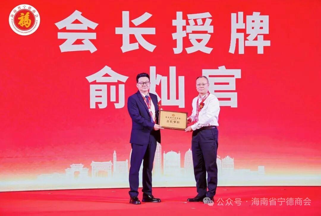 ↑海南省工商联党组成员刘峰松为俞灿官会长授牌