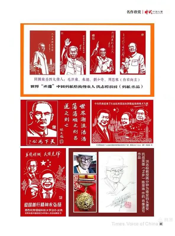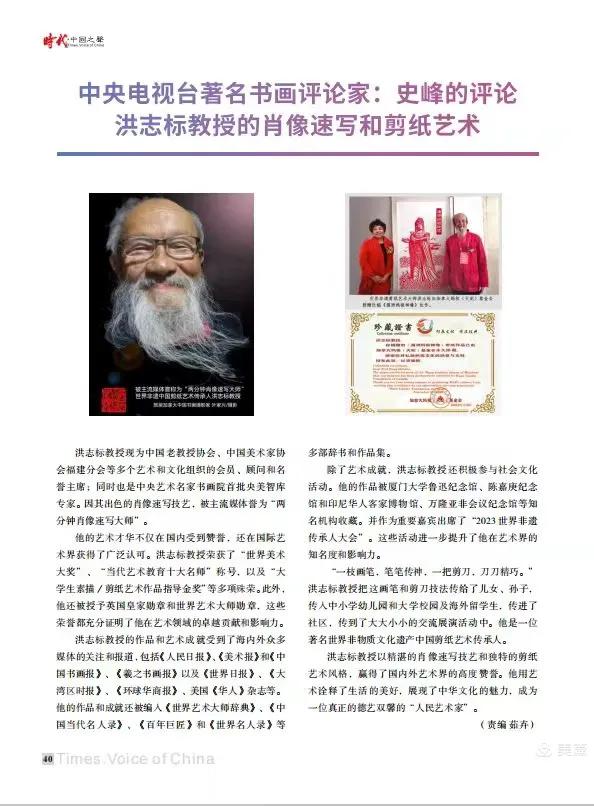 洪志标教授以精湛的肖像速写技艺和独特的剪纸艺术风格,赢得了国内外艺术界的高度赞誉。他用艺术诠释了生活的美好,展现了中华文化的魅力,成为一位真正的德艺双馨的“人民艺术家”。